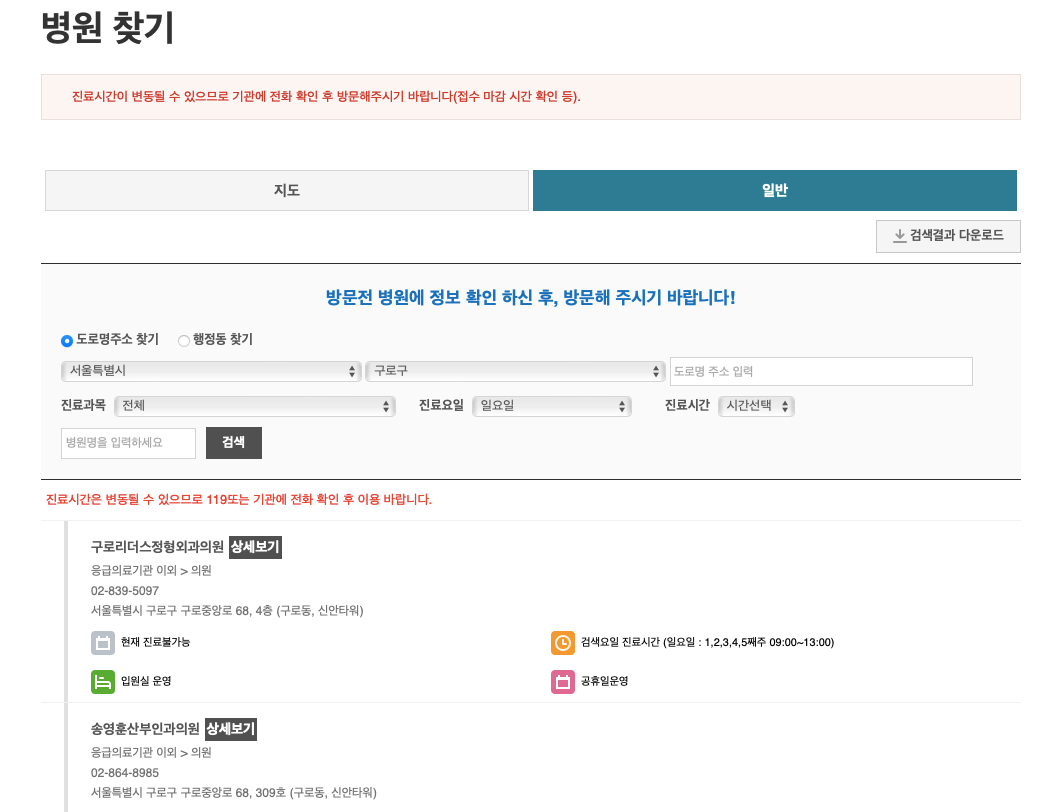 지도와 일반 카테고리 중 일반을 선택하시고, 시/도 선택과 구/군 선택, 진료과목 선택하시고 진료요일까지 선택을 하고 검색을 누르시면