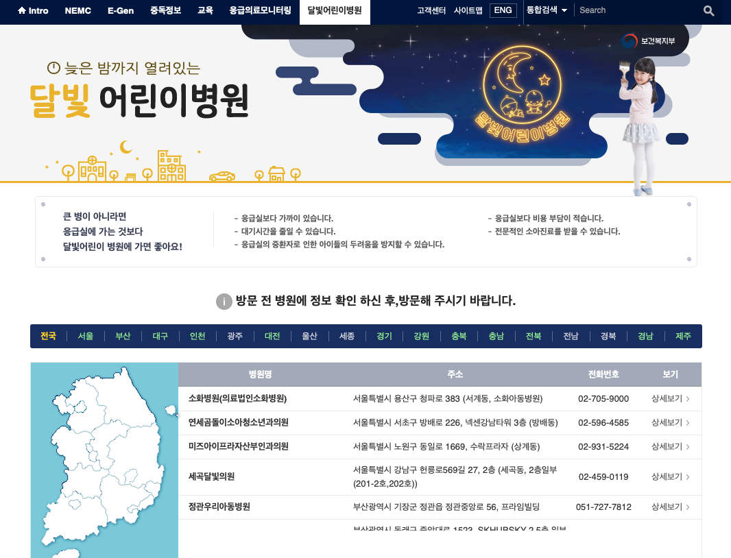 전국에서 운영 중인 달빛 어린이 병원 목록이 나옵니다.