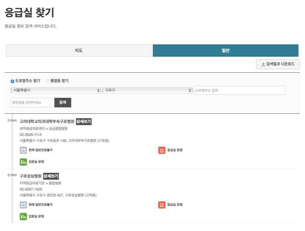 왼쪽 상단에 '응급실 찾기'를 클릭 후 지도와 일반 카테고리 중 일반을 선택하시고, 시/도 선택과 구/군 선택을 하시고 검색을 누르시면