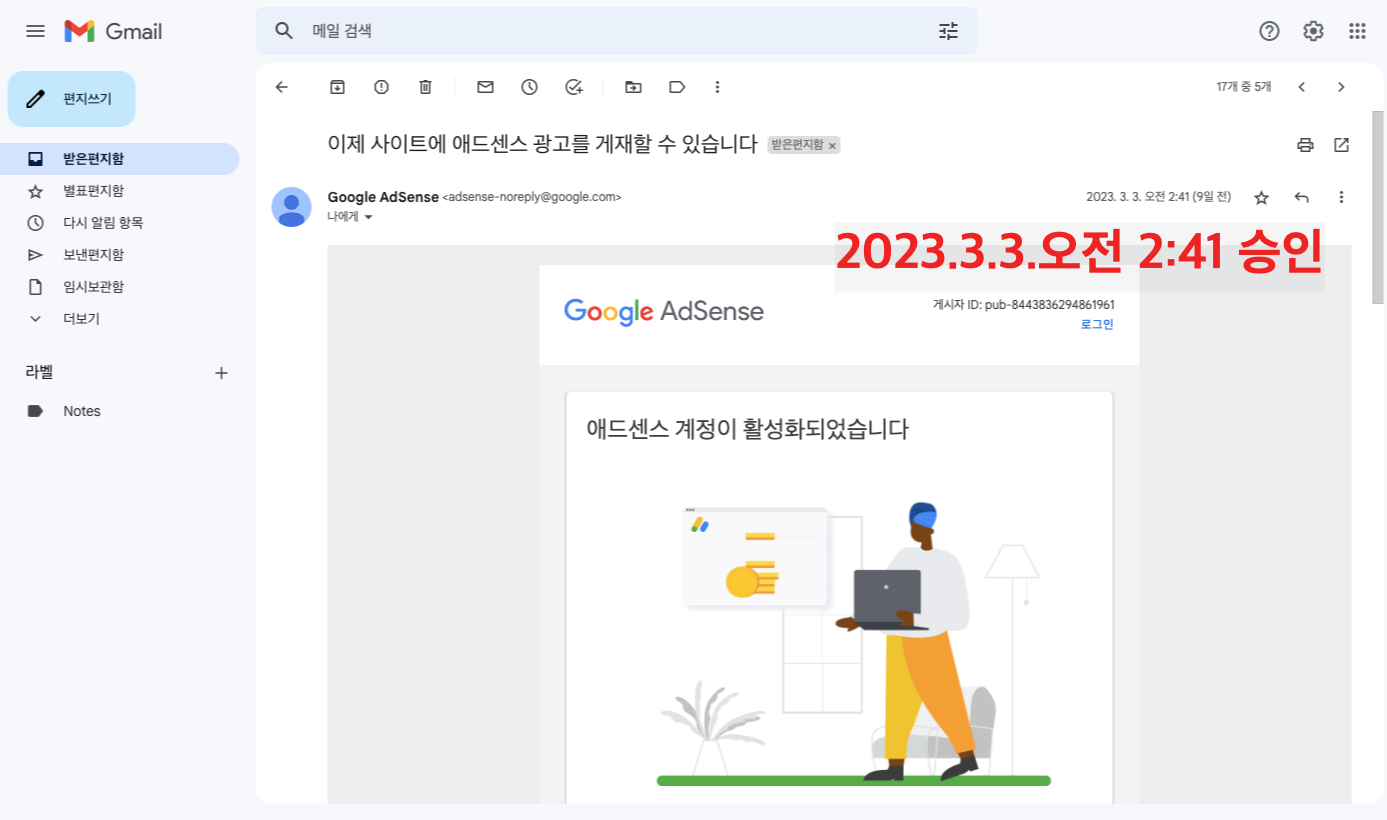 - 2023년 3월 3일 오전 2:41분 - 구글 애드센스로 부터 승인 메일 받음