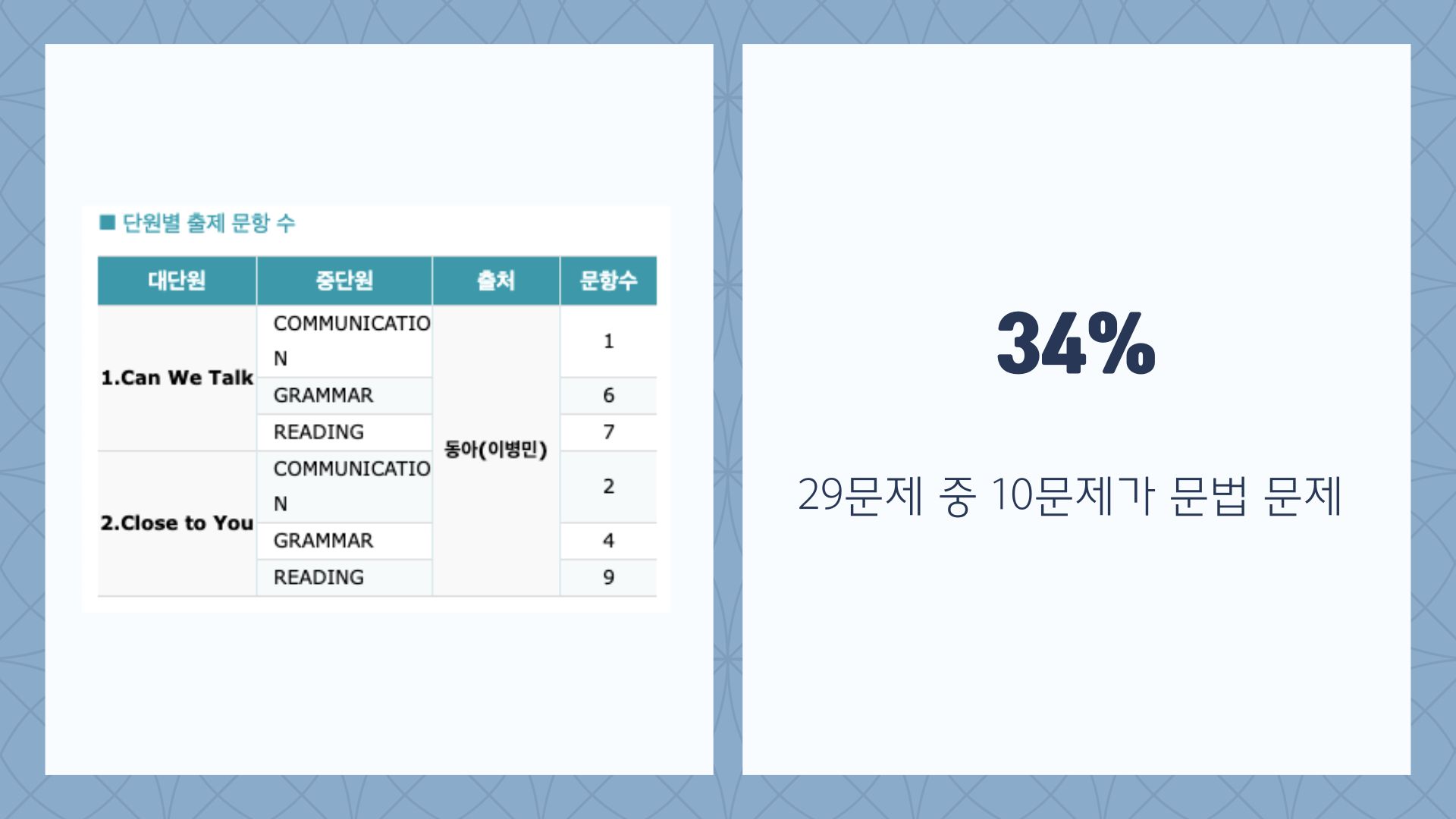 29문제 중에서 10문제가 문법 문제였습니다.