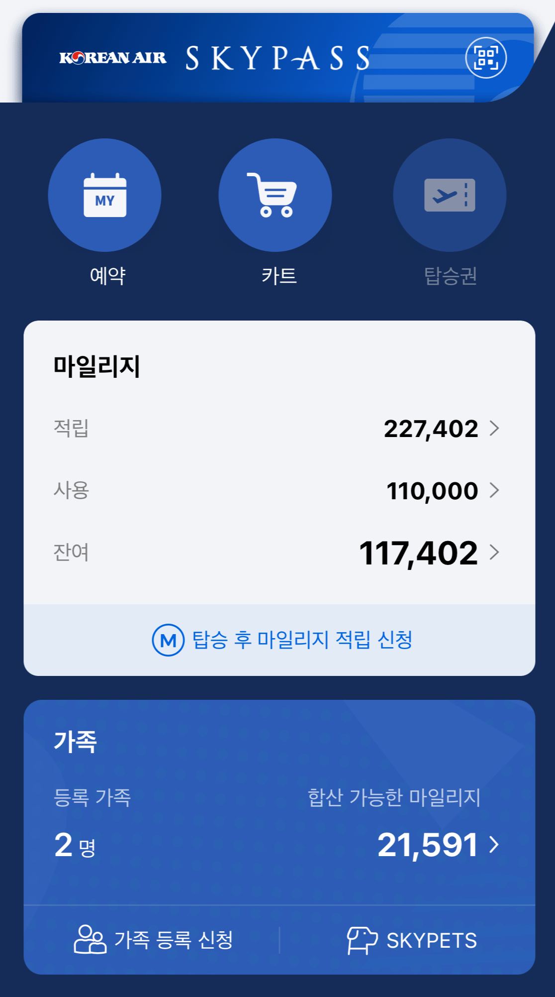 총 네 개의 대한항공 마일리지를 적립할 수 있는