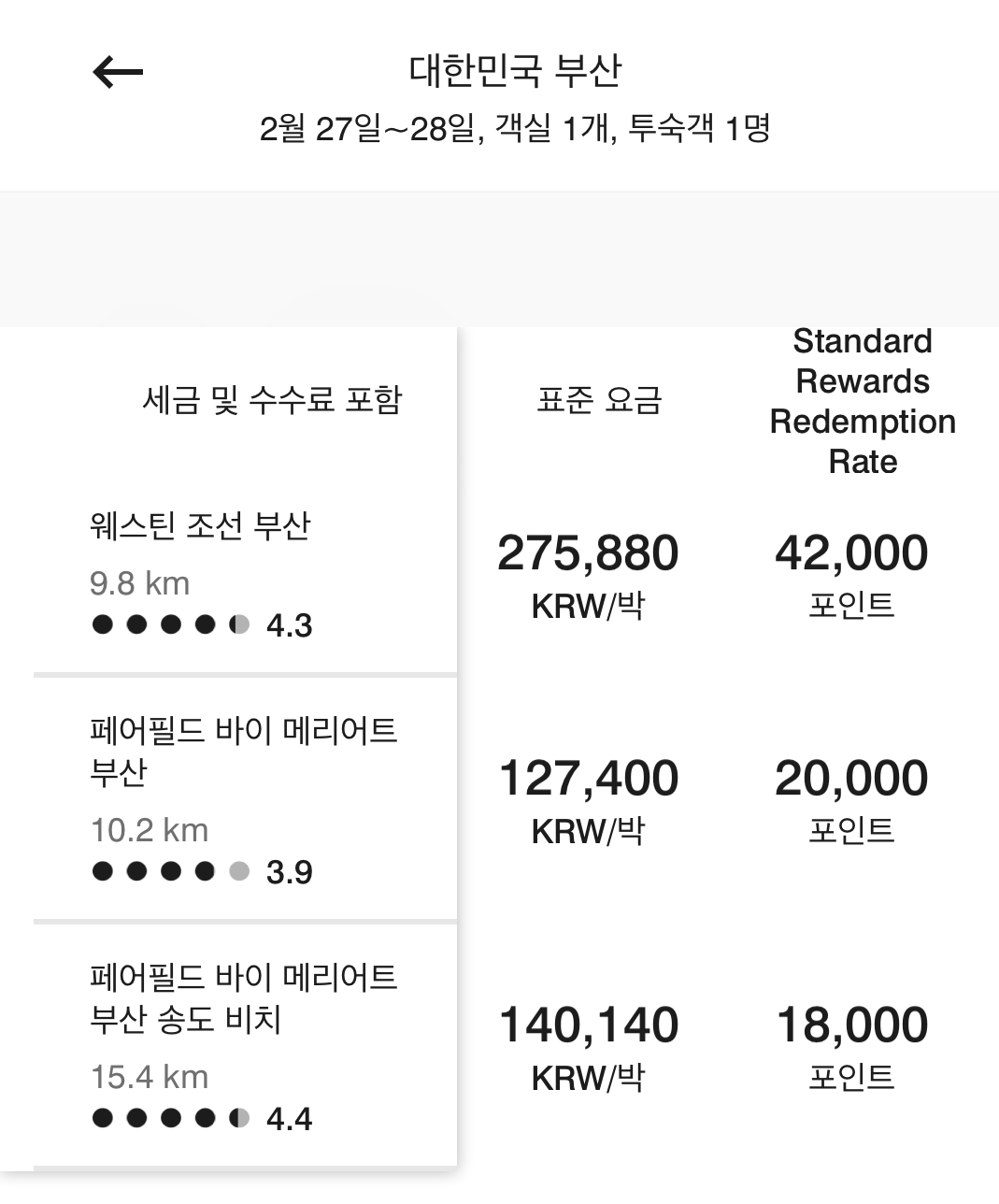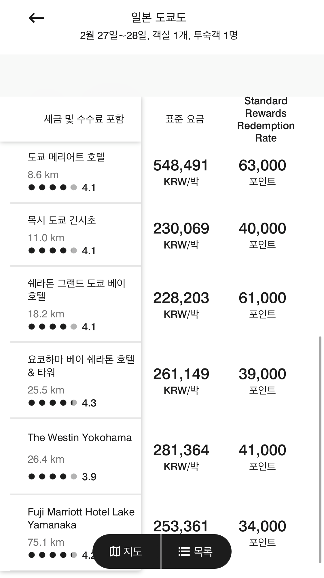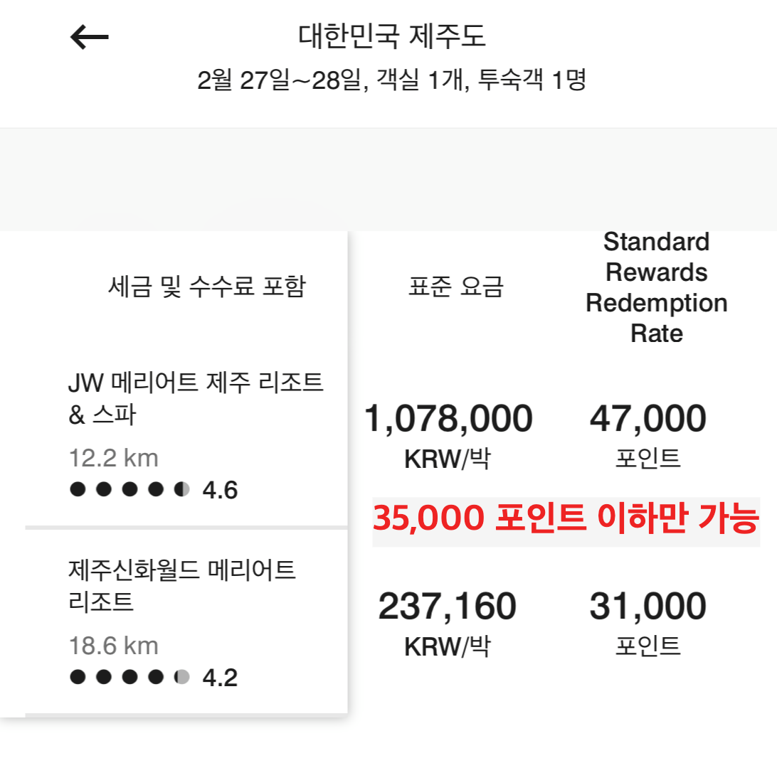 근데 3만 5천 메리어트 본보이 포인트로 예약할 수 있는 호텔이 많지 않습니다.