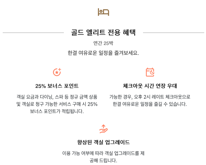 1. 객실 요금과 다이닝, 스파 등 정규 금액 상품 및 객실로 청구 가능한 서비스 구매 시 25% 보너스 포인트 적립