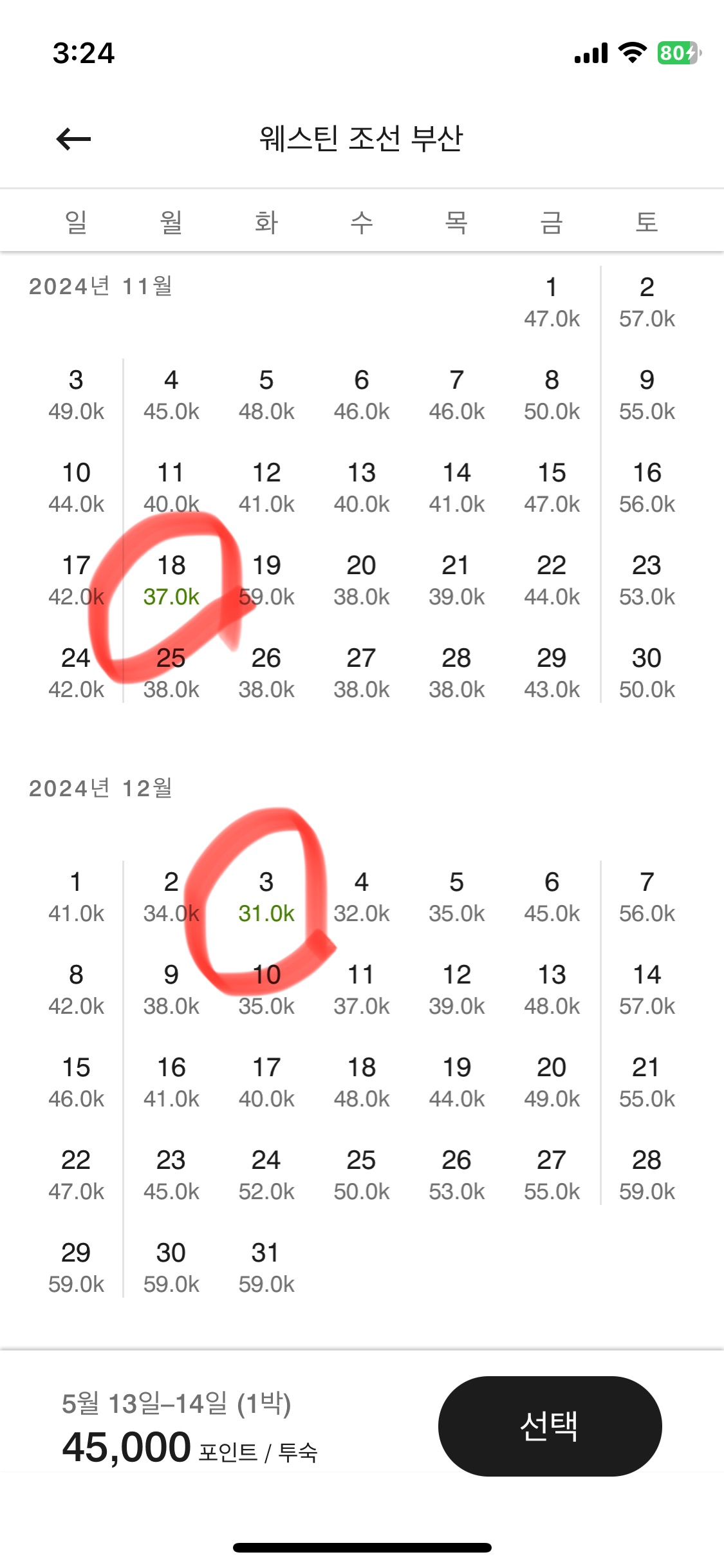 35,000포인트 이내로 예약할 수 있었는데,