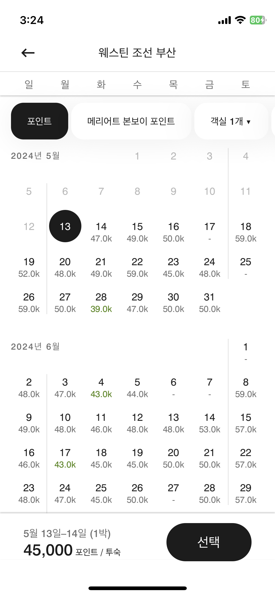 43,000포인트로 예약이 가능하니