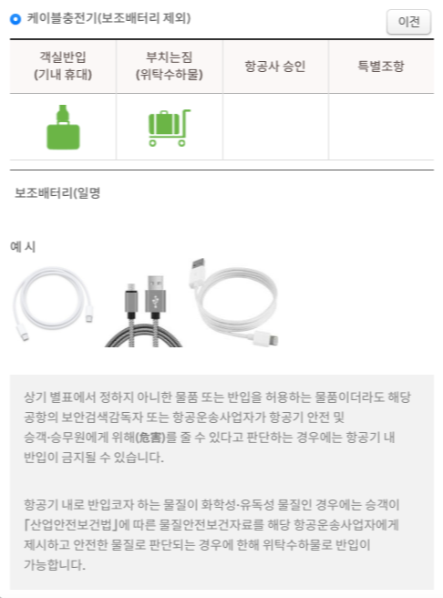 객실, 위탁수하물 반입 가능 여부를 알 수 있습니다.