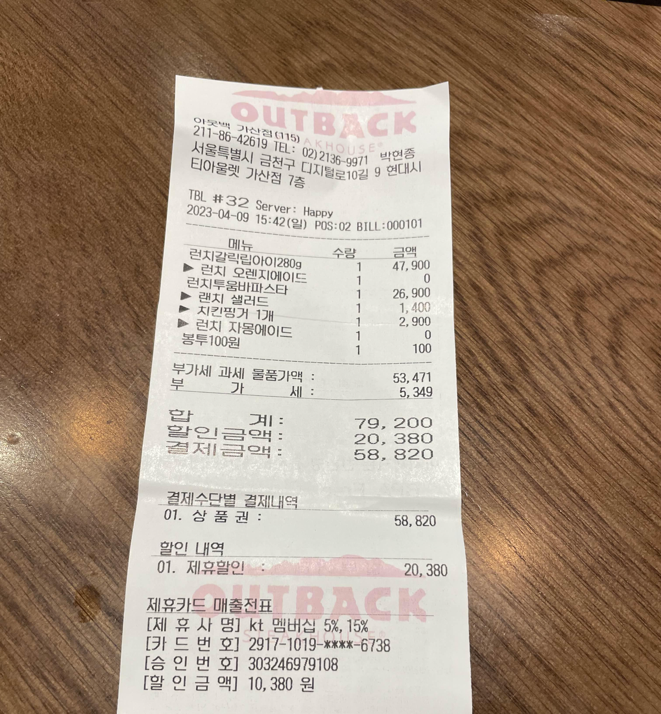 아웃백 가산점 직원들 서비스도 좋았고,