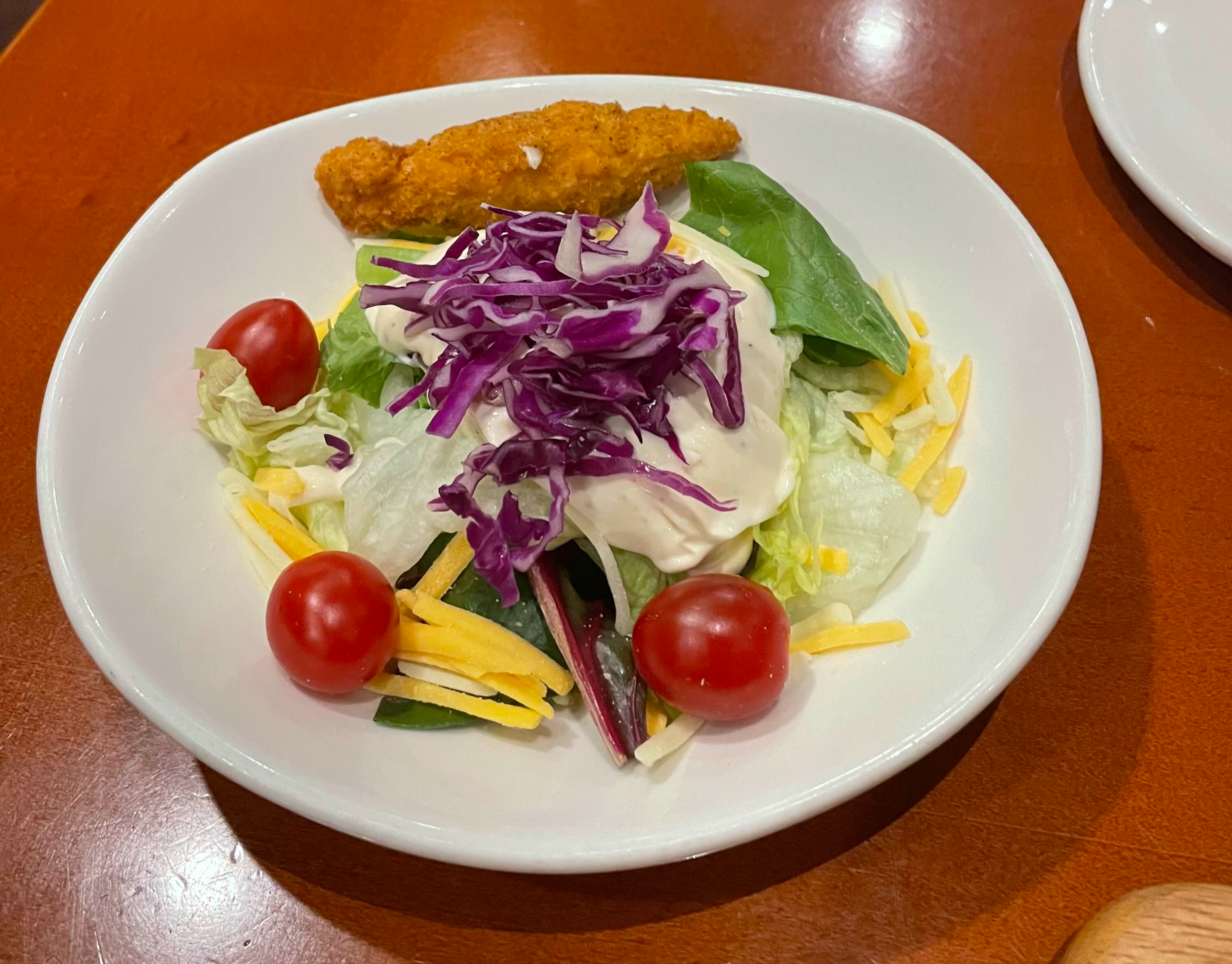 샐러드와 치킨 핑거 한 조각이 나왔습니다.