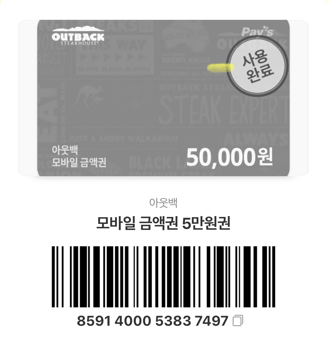 카톡으로 아웃백 상품권 5만원 권을