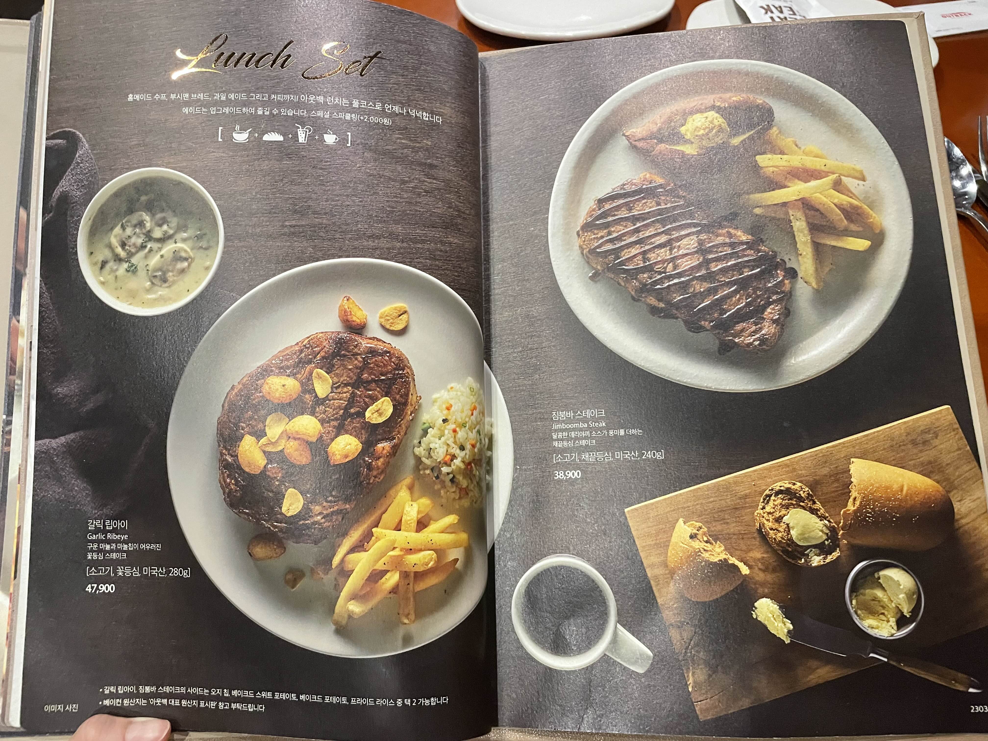 런치메뉴로 갈릭립아이와 투움바 파스타