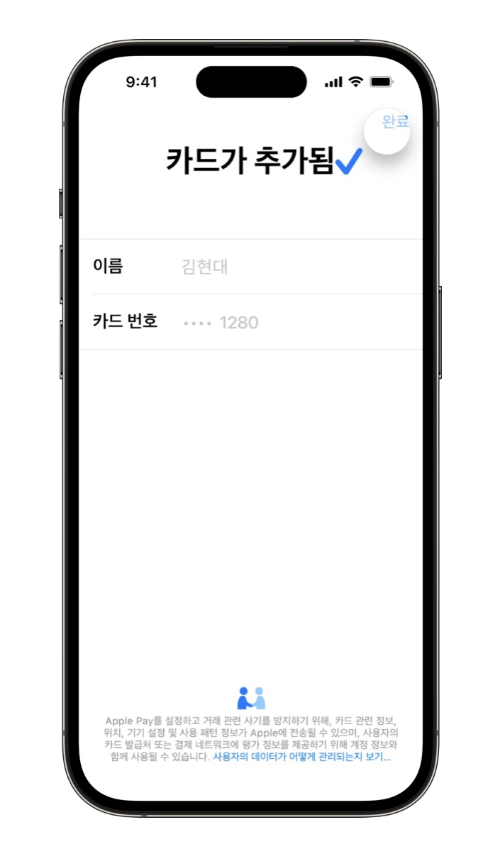 7. 이름과 카드번호를 입력하면 애플페이 등록이 완료됩니다.