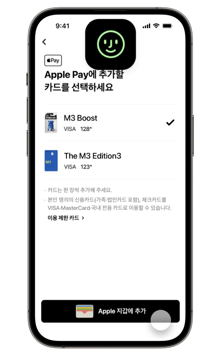 6. 애플페이에 추가할 카드를 선택하고, 애플 지갑에 추가를 누릅니다.