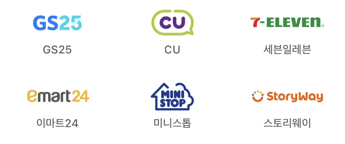 지에스24, 씨유, 세븐일레븐, 이마트24, 미니스톱, 스토리웨이에서 애플페이 결제가 가능합니다.