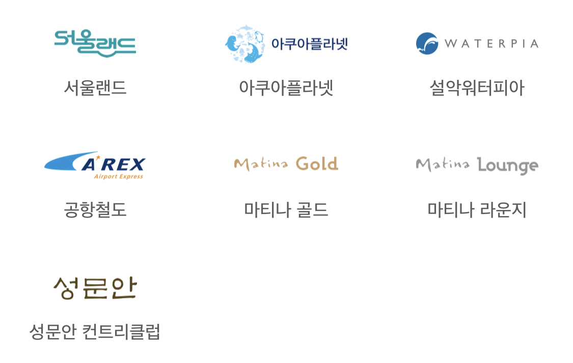 서울랜드, 아쿠아플라넷, 설악워터피아, 공항철도, 마티나 골드, 마티나 라운지, 성문안 컨트리클럽
