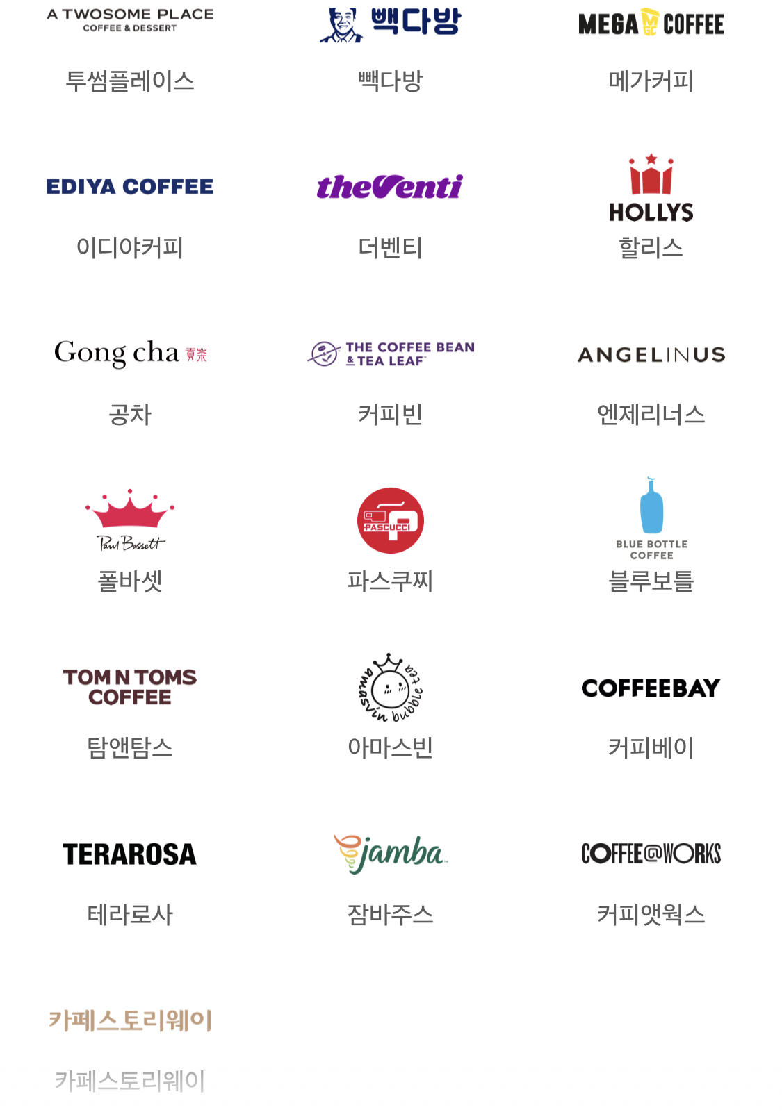 투썸플레잇, 빽다방, 메가커피, 이디아커피, 더벤티, 할리스, 공차, 커피빈, 엔제리너스, 폴바셋, 파스쿠찌, 블루보틀, 탐앤탐스, 아마스빈, 커피베이, 테라로사, 잠바주스, 커피앳웍스, 카페스토리웨이에서 애플페이로 결제 가능합니다.