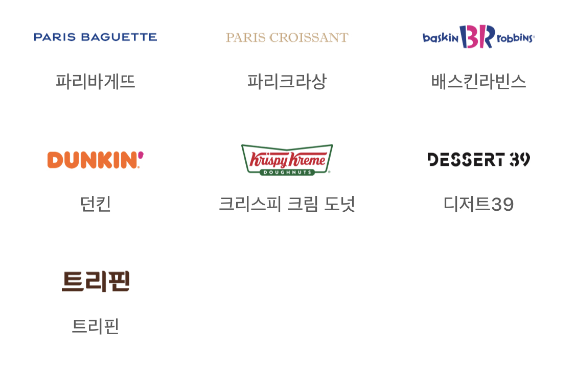 파리바게트, 파리크라상, 배스킨라빈스, 던킨, 크리스피 크림 도넛, 디저트39, 트리핀에서 애플페이 가능합니다.