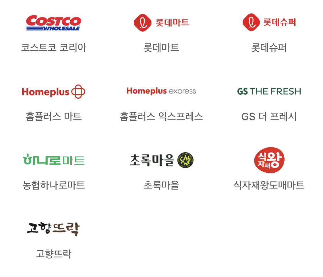 코스트코 코리아, 롯데마트, 롯데슈퍼, 홈플러스 마트, 홈플러스 익스프레스, 지에스 더 프레시, 농협하나로마트, 초록마을, 식자재왕도매마트, 고향뜨락에서 애플페이 사용 가능합니다.