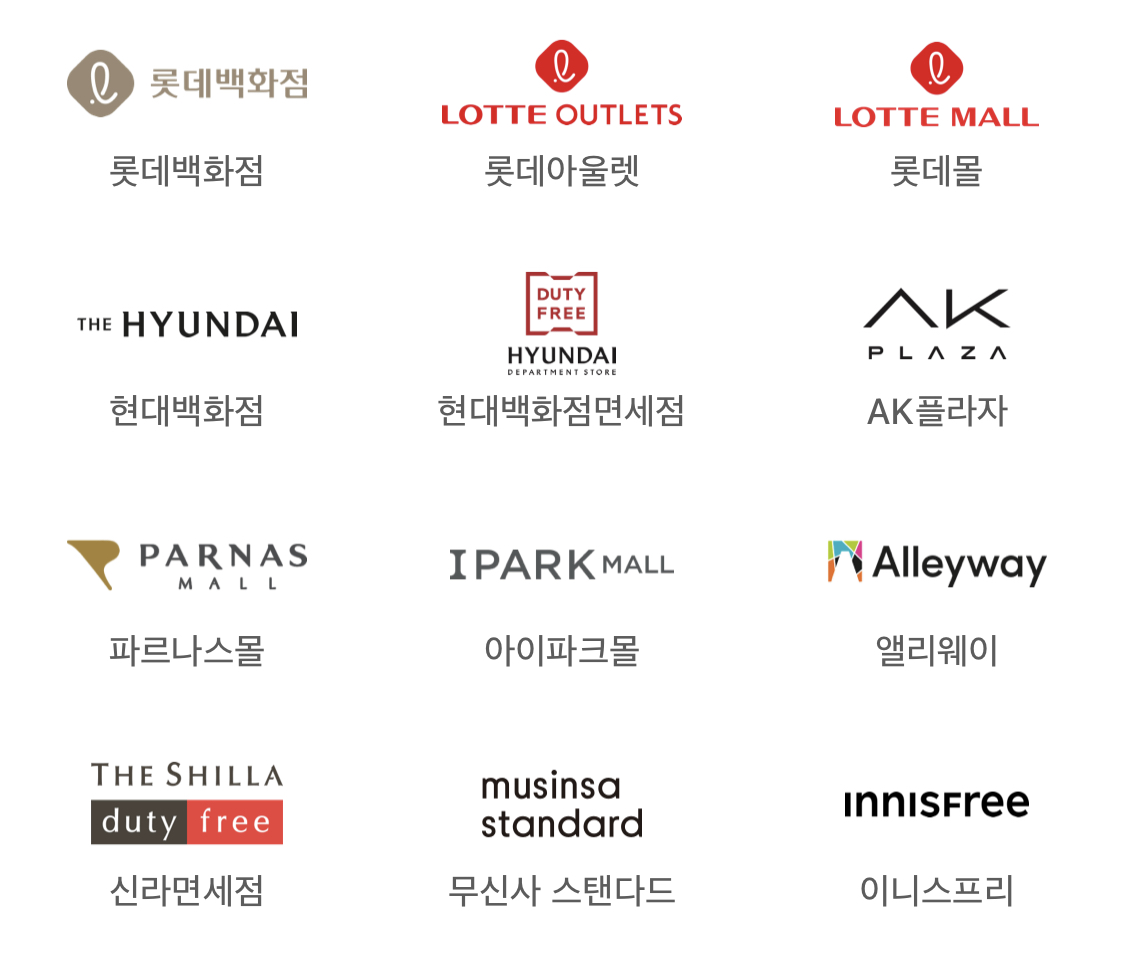 롯데백화점, 롯데아울렛, 롯데몰, 현대백화점, 현대백화점면세점, 에이케이플라자, 파르나스몰, 아이파크몰, 앨리웨이, 신라면세점, 무신사 스탠다드, 이니스프리에서 애플페이 사용 가능합니다.