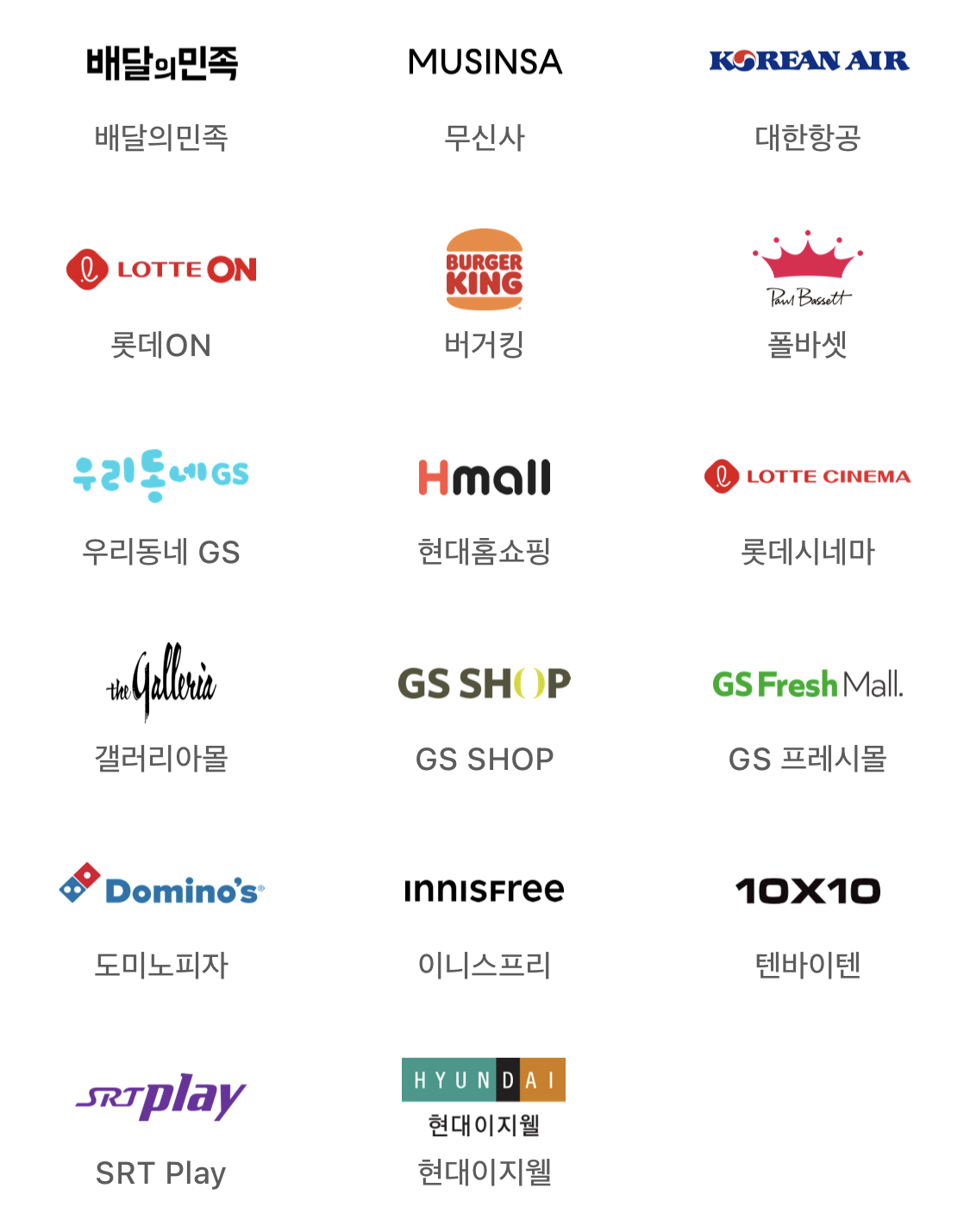 배달의민족, 무신사, 대한항공, 롯데온, 버거킹, 폴바셋, 우리동네지에스, 현대홈쇼핑, 롯데시네마, 갤러리아몰, 지에스샵, 지에스프레시몰, 도미노피자, 이니스프리, 텐바이텐, 에스알티플레이, 현대이지웰에서 애플페이 사용 가능합니다.