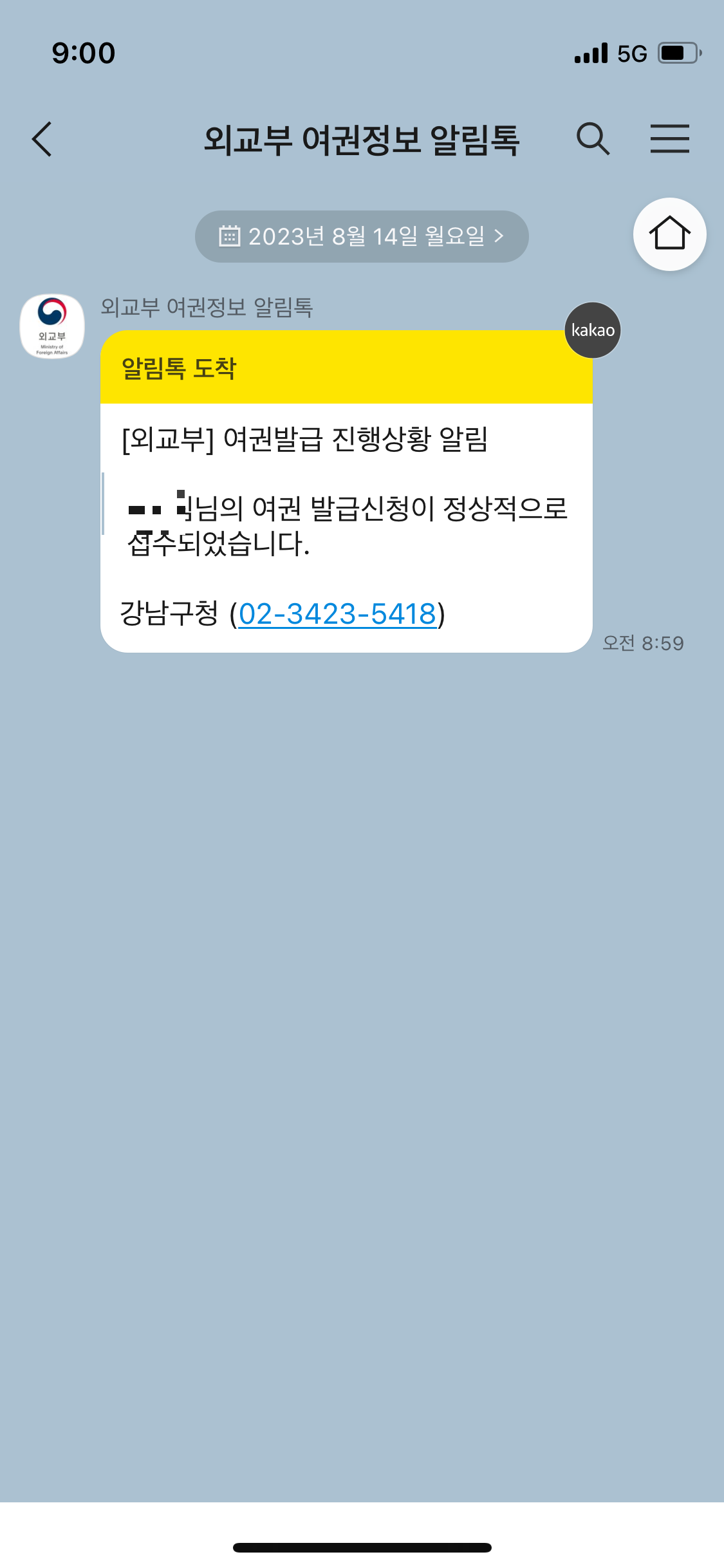 카톡으로 발급 신청이 접수되었다는