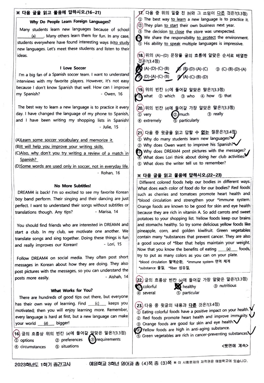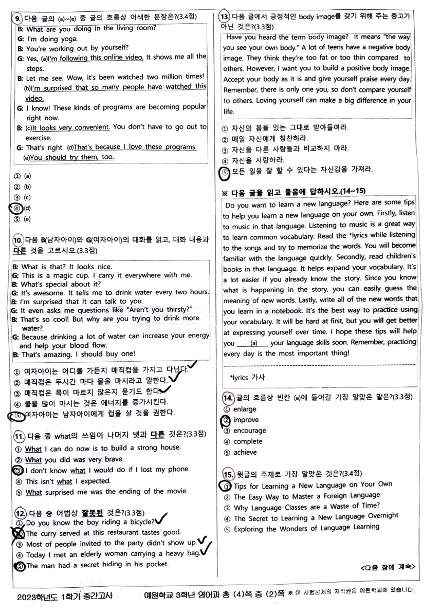 | 예원학교 2023년 2학년 2학기 중간고사 영어 기출 문제 (0) | 2023.10.10 |
