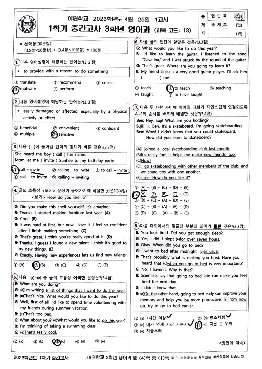 3학년 1학기 중간고사 영어 시험지 입니다.