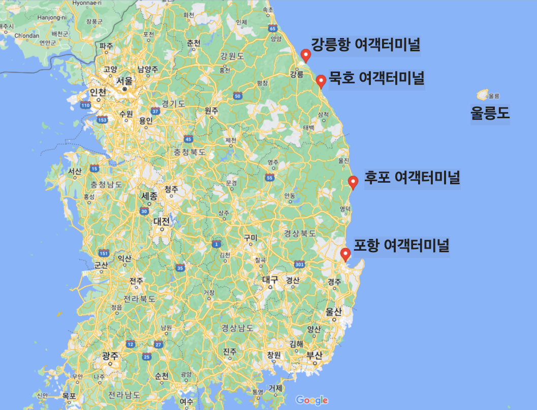 | 포항 | 사동 | 우리누리 1호 | 태성해운 | 현재 운행 X | 3시간 20분 | 68,500 | 61,800 | 34,250 |