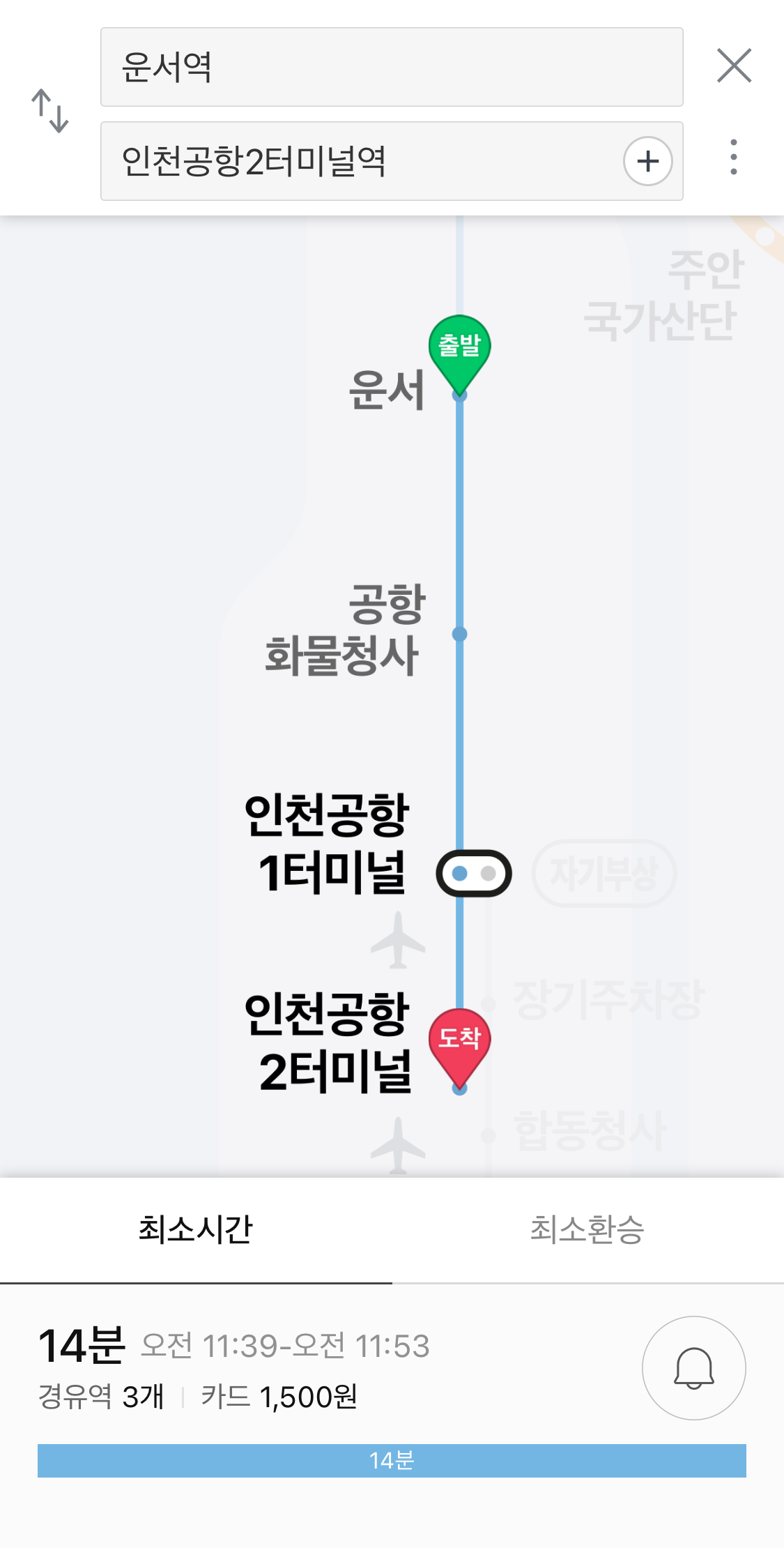 운서역에서 인천공항 2터미널까지 3개역이며, 14분 소요됩니다.