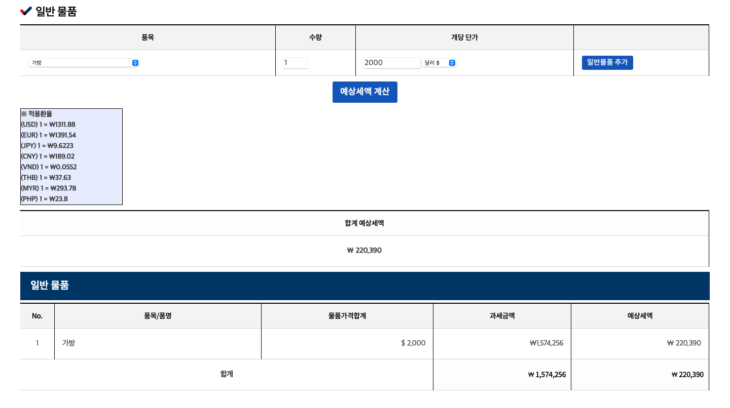 ↓↓↓ 면세 물품 예상 세액 계산 - 관세청 홈페이지 바로가기 ↓↓↓