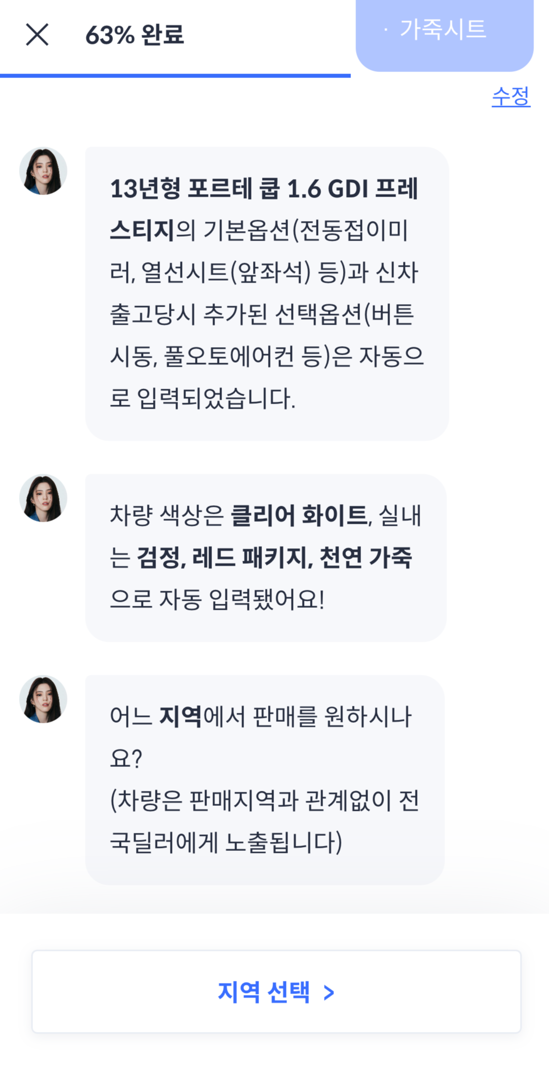 주행거리 입력, 차량 옵션 선택, 사고 내역, 판매 지역을 입력합니다.