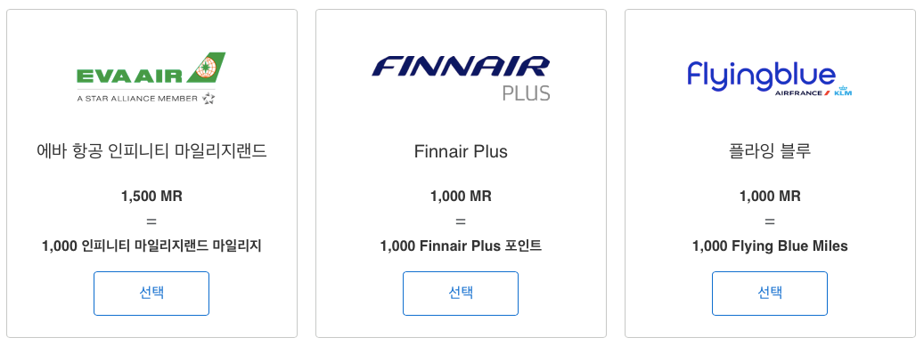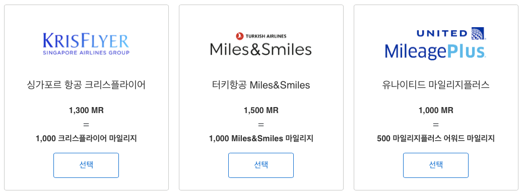 | 항공사 | 멤버십 리워즈(MR) | 항공사 마일리지 |
