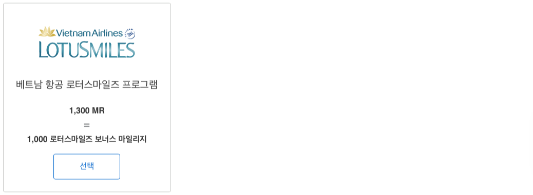 | 베트남 항공 로터스마일즈 프로그램 | 1,300 멤버십 리워즈 | 1,000 로터스마일즈 보너스 마일리지 |