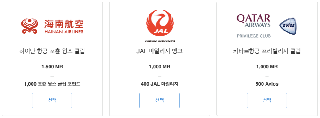 | 항공사 | 멤버십 리워즈(MR) | 항공사 마일리지 |