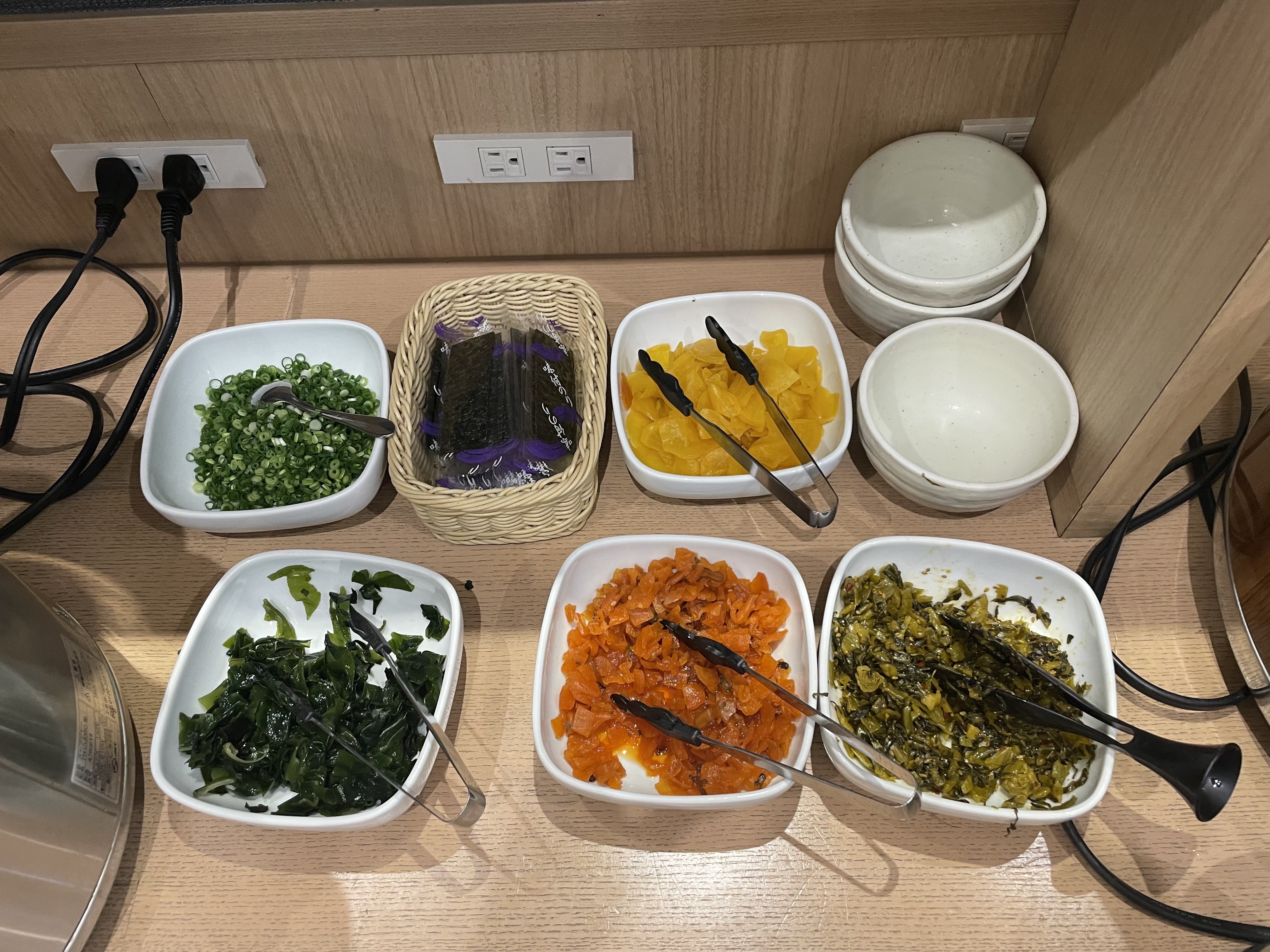 카레, 일본식 된장국, 옥수수 스프가 있어요.